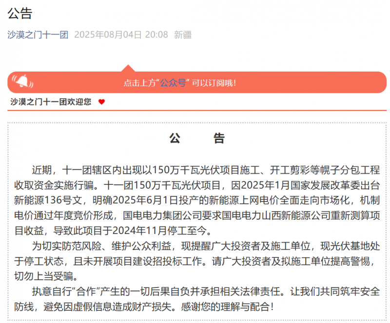 8月4日,沙漠之門十一團公眾號發(fā)布辟謠公告,稱十一團轄區(qū)內(nèi)出現(xiàn)以150萬千瓦光伏項目施工、開工剪彩等幌子分包工程收取資金實施行騙。