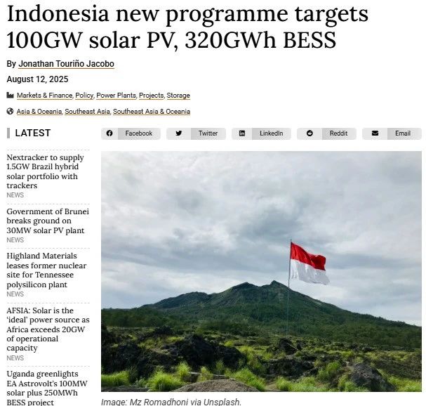 兩個月前,印尼政府批準了一項計劃,計劃到2034年增加42.6GW的可再生能源裝機容量和10.3GW的儲能容量,以支持該國國有電力公司。其中,太陽能光伏將是主力,規劃裝機達17.1GW。