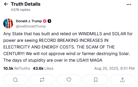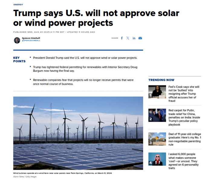 他主推的“大而美法案”將在2027年底前終止風能和太陽能的投資和生產稅收抵免。這些抵免在美國可再生能源擴張中發揮了關鍵作用。