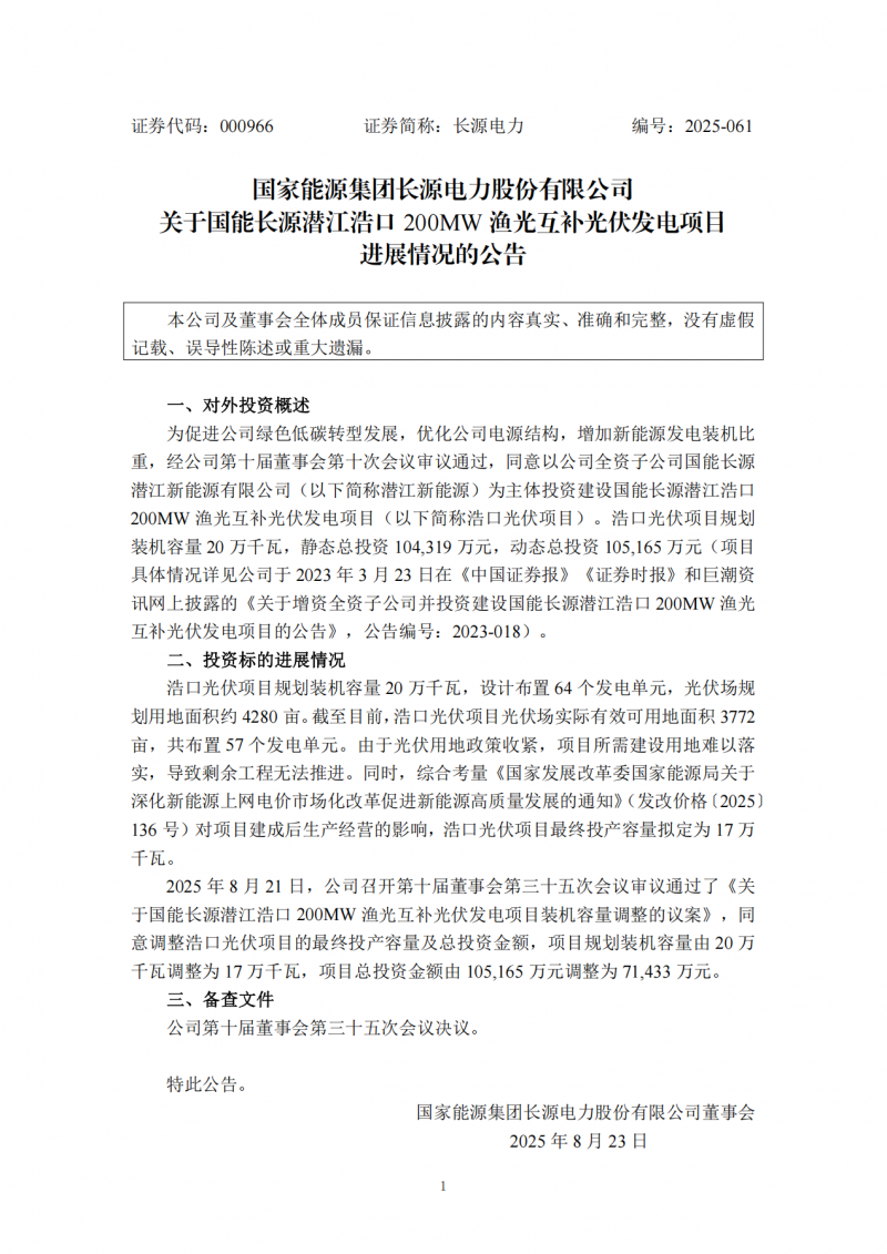 2025年8月21日,長源電力召開第十屆董事會第三十五次會議審議通過了《關于國能長源潛江浩口200MW漁光互補光伏發電項目裝機容量調整的議案》,同意調整浩口光伏項目的最終投產容量及總投資金額,項目規劃裝機容量由20萬千瓦調整為17萬千瓦,項目總投資金額由105,165萬元調整為71,433萬元。
