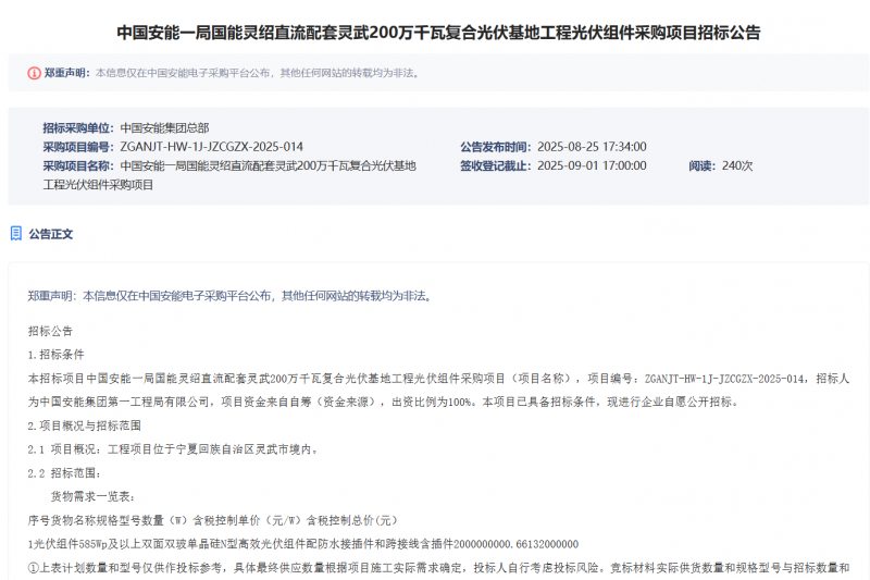 根據招標公告,本次集采的光伏組件型號為585Wp及以上雙面雙玻單晶硅N型高效光伏組件,配防水接插件和跨接線含插件200MW。