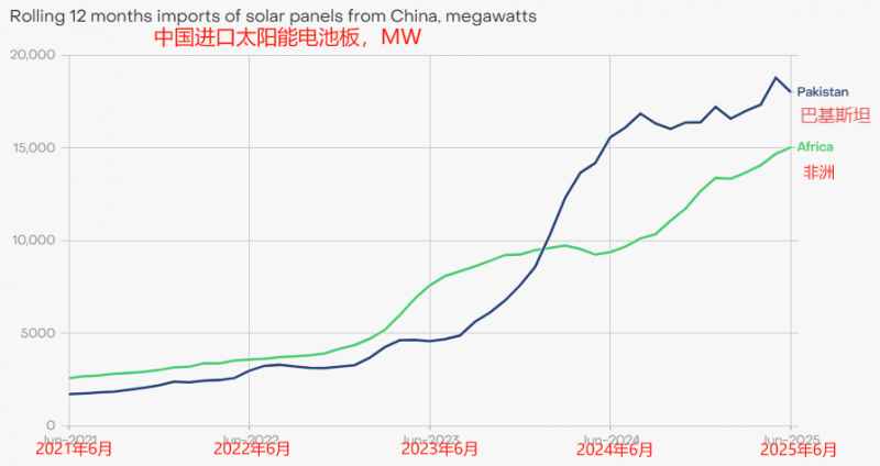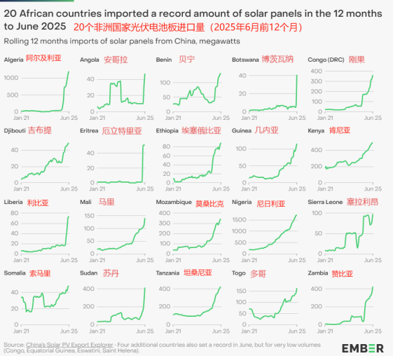 近日據全球能源智庫Ember報道,截至2025年6月的12個月內,非洲太陽能電池板進口量創下新高,達到15,032MW,比前12個月的進口量9,379MW增長了60%。