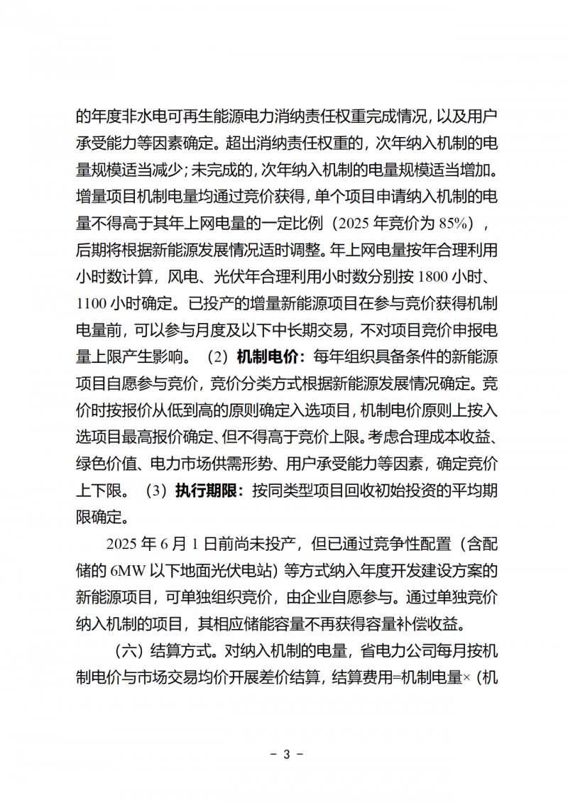 電量規(guī)模:按項(xiàng)目實(shí)際上網(wǎng)電量乘以年機(jī)制電量比例確定。單個(gè)項(xiàng)目年機(jī)制電量比例,按其2024年度上網(wǎng)電量扣減當(dāng)年中長期(含綠電)合同實(shí)際結(jié)算電量(小于零則按零處理,下同)占當(dāng)年上網(wǎng)電量的比例確定。新能源項(xiàng)目在機(jī)制電量規(guī)模范圍內(nèi)每年自主確定執(zhí)行機(jī)制的電量比例、但不得高于上一年。鼓勵(lì)新能源項(xiàng)目通過設(shè)備更新改造升級(不含增容)等方式,主動(dòng)參與市場競爭。