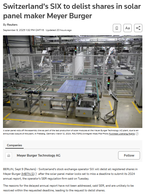 然而,2024年以來,全球太陽能行業陷入產能過剩與價格戰,亞洲低價組件大量涌入歐美市場,導致梅耶博格這類高成本歐洲制造商難以生存。盡管其技術領先,卻無法在價格競爭中站穩腳跟。