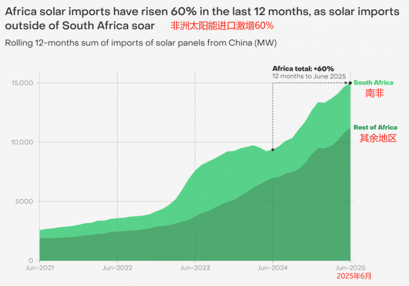 據全球能源智庫Ember報告顯示,在截至2025年6月的12個月中,非洲太陽能電池板進口量大幅攀升至15,032MW,創下歷史新高,較此前12個月的9,379MW激增60%。這一增長背后,離不開中國企業在產品供應、項目開發和系統集成等方面的持續助力。