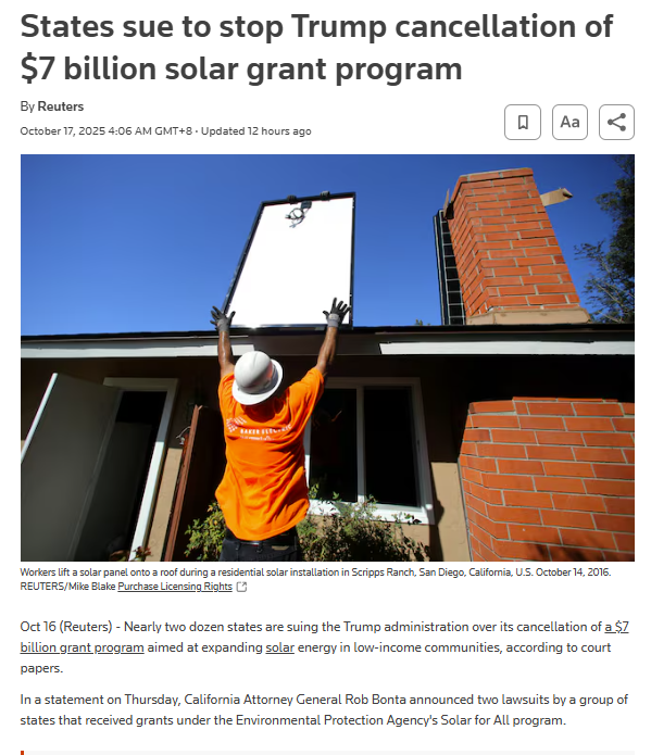 如果順利實施,該計劃預計能為100萬美國家庭減少至少20%的電費,每年節(jié)省約3.5億美元。然而,今年8月7日,美國環(huán)保署署長李·澤爾丁突然宣布終止該計劃,并收回了已撥付資金的約90%。