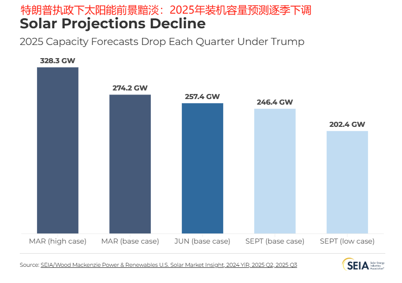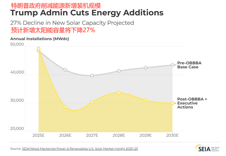 美國太陽能行業(yè)協(xié)會和伍德麥肯茲的預測顯示,特朗普政府的政策可能導致2026年至2030年間新增太陽能裝機容量下降27%。