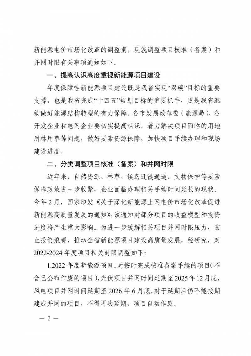 1.2022年度新能源項目。對按時完成核準(zhǔn)備案手續(xù)的項目(不含已公布作廢的項目),光伏項目并網(wǎng)時間延期至2025年12月底:風(fēng)電項目并網(wǎng)時間延期至2026年6月底。對于延期后仍不能按期建成并網(wǎng)的項目,不得再次延期,項目自動作廢。