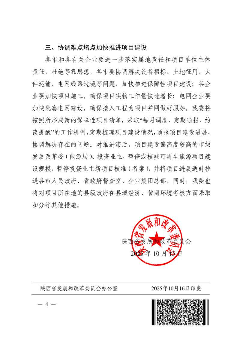 《通知》還指出,協(xié)調(diào)難點堵點加快推進(jìn)項目建設(shè)。對推進(jìn)滯后,項目建設(shè)偏離度較高的市級發(fā)展改革委(能源局)、投資業(yè)主,暫停或核減可再生能源項目建設(shè)規(guī)模,暫停投資業(yè)主新項目核準(zhǔn)(備案),并將項目進(jìn)展適時抄送各市人民政府、省政府督查室、企業(yè)集團(tuán)總部。同時,也將對項目所在地的縣級政府在縣域經(jīng)濟、營商環(huán)境考核方面采取扣分等其他措施。