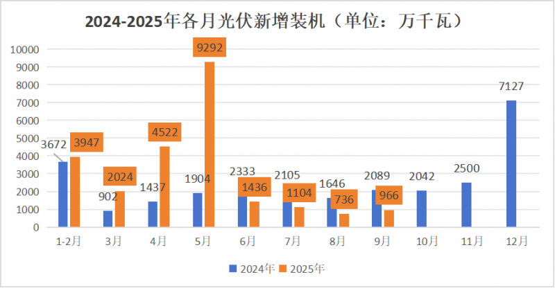 其中2025年1-9月,國內(nèi)新增光伏裝機240.27GW,同比增長49.35%;計算可得9月單月光伏新增規(guī)模9.66GW,對比8月數(shù)據(jù)來看,環(huán)比增長31.25%,對比去年同期數(shù)據(jù),同比下降53.76%。