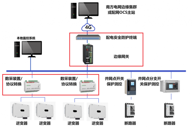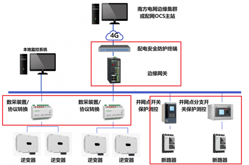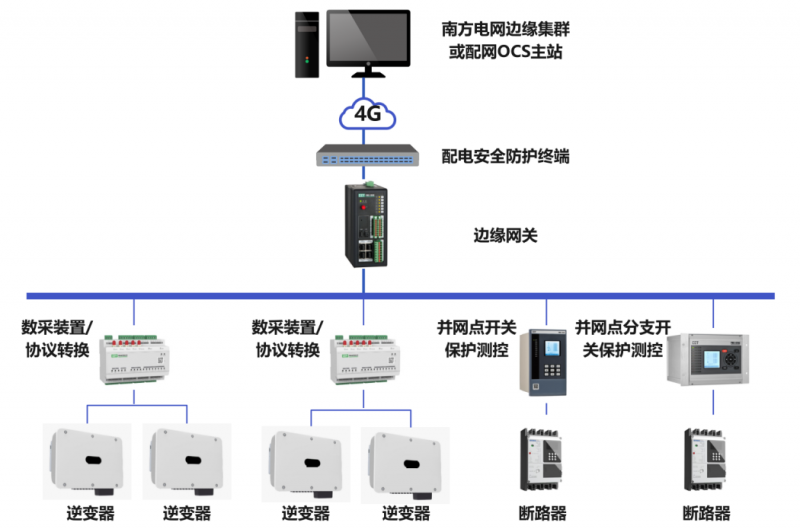 嚴(yán)格響應(yīng)國家能源局“四可”政策規(guī)定,根據(jù)管理規(guī)定及技術(shù)規(guī)范排查,現(xiàn)場具備自動(dòng)化開關(guān)和測控裝置,需要配置邊緣網(wǎng)關(guān)、數(shù)采裝置/協(xié)議轉(zhuǎn)換、配電安全防護(hù)裝置。