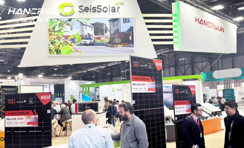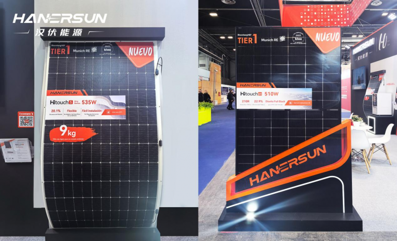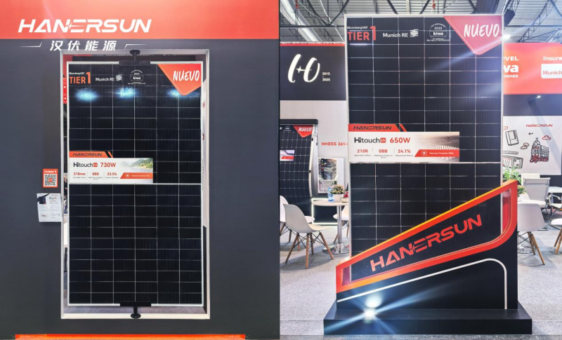 此次展會,漢伏能源柔性青云系列組件HITOUCH 5 535W首次登陸西班牙,吸引眾多關注。組件僅重9kg,較傳統組件輕70%,無需額外支架即可貼合各類建筑屋頂,完美破解城市老舊建筑屋頂承重難題。HITOUCH 6N 730W及HITOUCH 6N 650W矩形組件同樣首秀展會,憑借高功率密度與低衰減特性,可大幅降低南部高輻照地區大型地面電站的度電成本,適配規模化裝機需求,成為展臺亮點。
