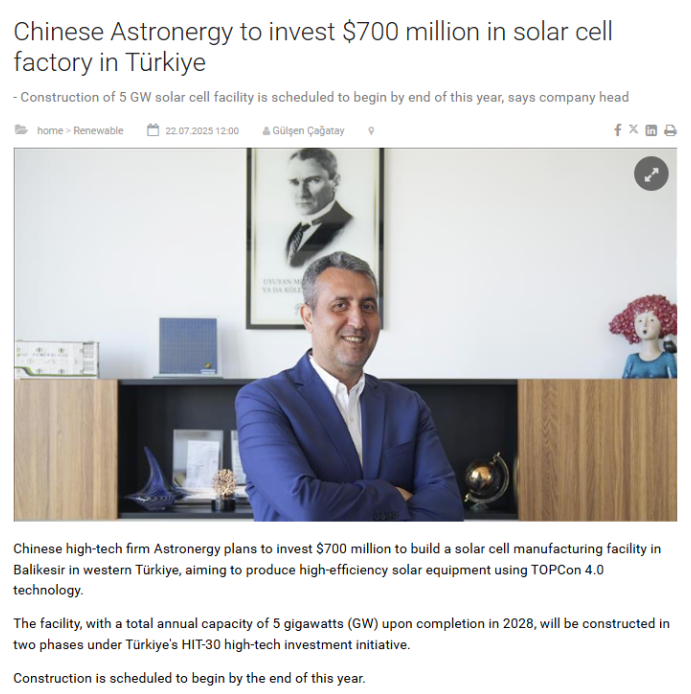所謂“HIT-30高科技投資計劃”,是土耳其政府于2024年7月推出,旨在吸引國際企業在電動車、半導體、電池及可再生能源等領域投資,目標總投資額達300億美元。此前,比亞迪已宣布投資10億美元在土耳其建設電動車工廠,正泰新能則是該國唯一一家100%外資控股的太陽能電池制造商。