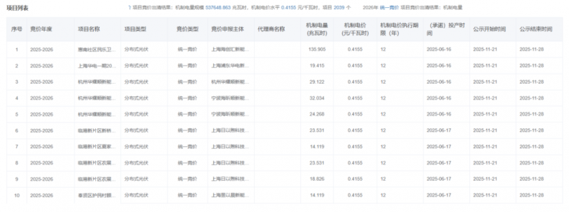 根據(jù)公示,本批次為統(tǒng)一競價(jià),機(jī)制電量規(guī)模為5.3765億千瓦時(shí),機(jī)制電價(jià)水平0.4155元/千瓦時(shí),項(xiàng)目2039個(gè)。