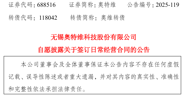 11月26日,奧特維發(fā)布無(wú)錫奧特維科技股份有限公司自愿披露關(guān)于簽訂日常經(jīng)營(yíng)合同的公告 。