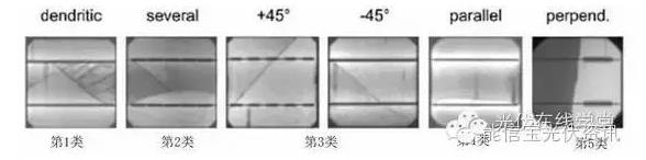 2011年,德國ISFH公布了他們的研究結果:根據電池片隱裂的形狀,可分為5類:樹狀裂紋、綜合型裂紋、斜裂紋、平行于主柵線、垂直于柵線和貫穿整個電池片的裂紋。