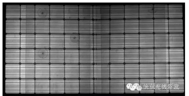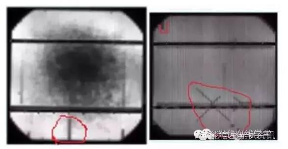 給晶硅組件施加電壓后,所激發出的電子和空穴復合的數量越多,其發射出的光子也就越多,所測得的EL圖像也就越亮;如果有的區域EL圖像比較暗,說明該處產生的電子和空穴數量較少,代表該處存在缺陷(復合中心);如果有的區域完全是暗的,代表該處沒有發生電子和空穴的復合,也或者是所發光被其它障礙所遮擋,無法檢測到信號。