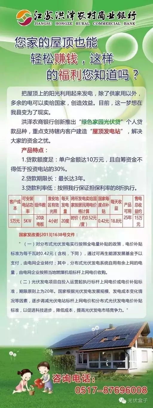 家庭屋頂光伏發電項目消費貸款業務是郵儲銀行新余市分行新推出的消費貸款業務,該類貸款主要用于支付屋頂光伏發電設備款,貸款期限最高為3年,貸款額度最高可達5萬元,采取等額本息還款法,大大降低了用戶的融資成本,所需貸款資料簡單,貸款流程便捷,審批效率高,可有效滿足廣大城市、城郊、農村等客戶用屋頂光伏設備進行發電的需求。