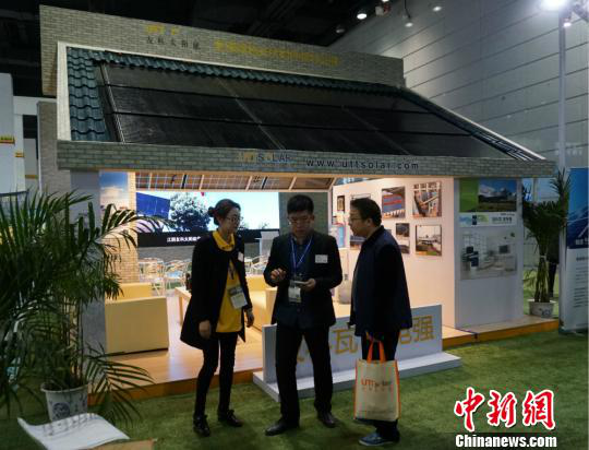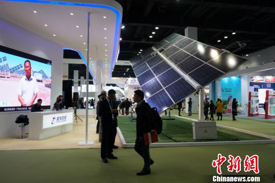 第八屆中國(guó)(無錫)國(guó)際新能源大會(huì)暨展覽會(huì),參觀嘉賓在碩大的太陽能板下停留?!O權(quán) 攝