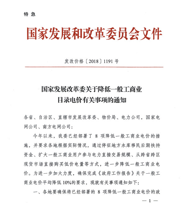 2018年3月28日,發(fā)改委發(fā)布了特急《關于降低一般工商業(yè)電價有關事項的通知》,分兩批實施降價措施,第一批降價措施全部用于降低一般工商業(yè)電價,自2018年4月1日起執(zhí)行。