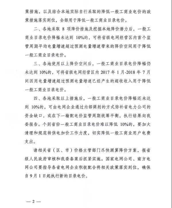 7月25日,國家發(fā)改委發(fā)布《關于利用擴大跨省區(qū)電力交易規(guī)模等措施降低一般工商業(yè)電價有關事項的通知》,將擴大跨省區(qū)電力交易規(guī)模、國家重大水利工程建設基金征收標準降低25%、督促自備電廠承擔政策性交叉補貼等電價空間,全部用于降低一般工商業(yè)電價,規(guī)定自2018年7月1日起執(zhí)行。