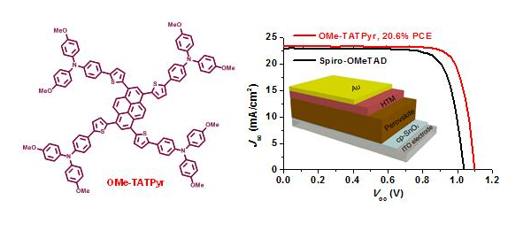 最近,在中國科學院先導專項和國家自然科學基金委支持下,中科院化學研究所光化學重點實驗室研究員鐘羽武和分子納米結構與納米技術重點實驗室研究員胡勁松合作,發展了一類低成本、易制備二維共軛有機小分子空穴傳輸材料OMe-***yr,將其應用于鈣鈦礦太陽能電池中,取得平均20%的能量轉化效率。
