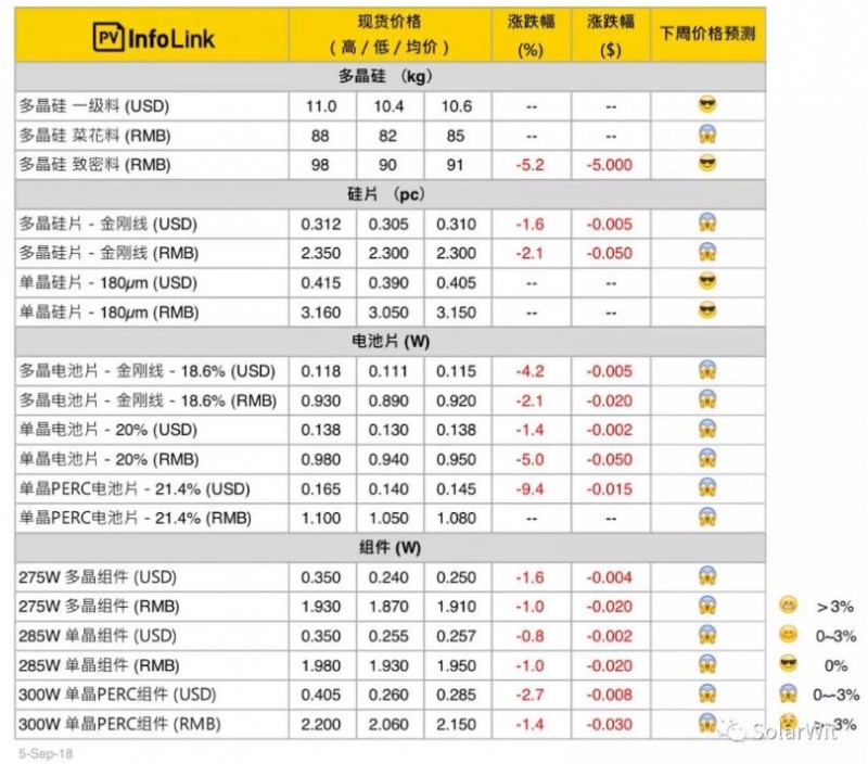 9月3日歐盟決定不在延長MIP雙反措施,當國內光伏企業歡呼雀躍,大呼自己的產能迎來新的出海口的同時,臺灣的電池業者可能怎么也高興不起來,得益于貿易保護措施,東南亞地區的電池產能一直享受著區位布局帶來的超額收益,就以上半年歐洲地區為例,2018年H1出口歐洲地區的組件均價依然維持在36歐分(折合42美分)的高位,而現在貿易保護措施取消,國內產能可以大規模沖擊歐洲市場,在這之前,歐洲市場是臺灣產能得以殘喘重要根據地,而這塊曾經讓人艷羨的市場,伴隨著MIP的正式取消,瞬間變成了價格紅海,和駐扎歐洲的朋友聊天得知:此時輸往歐洲市場的組件價格已經來到20~22歐分的地位,比起印度市場,現在歐洲市場組件價格更貴的唯一邏輯是路途更遠,運費更貴。當我們了解這樣的背景,就不難理解為何本周以美金計價的光伏產品跌幅更大、跌幅更猛啦。