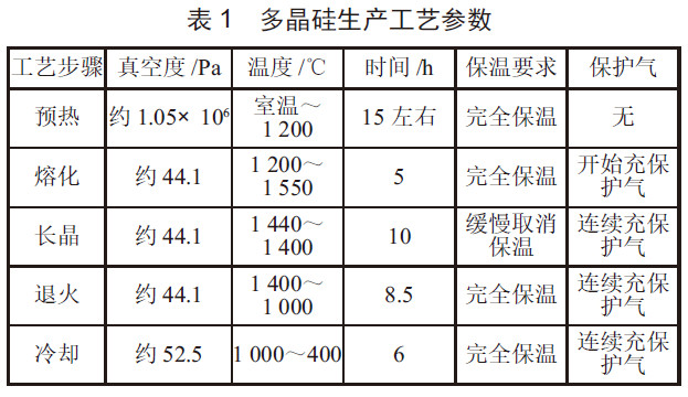 多晶硅鑄錠爐的生產工藝是將熱交換法和布里曼法進行了結合,硅在鑄錠爐內發生結晶,硅錠生產加熱過程中底部的隔熱層和爐的保溫層確保了嚴密的閉合狀態,從而避免了硅錠生產熱量的外泄和溫度的不均衡造成的硅錠受熱不均衡,為硅錠長晶創造了良好的環境。當鑄錠爐內的硅錠出現結晶情況時,開始向爐內充入保護器,在保持熔融硅原料的坩堝位置不變的情況下將保溫層進行升高,這時保溫層與隔熱層之間會出現縫隙,坩堝底部的熱量便會通過這個空隙散發出去,爐壁和氣體這樣的熱量置換使得坩堝底部的溫度逐漸降低,已經完成結晶的材料便會從加熱區離開,但是熔融的硅液體卻不會離開,使得硅錠結晶過程中固體和液體的界面形成了較為穩定的溫度梯度。鑄錠爐生產工藝的特點表現為液相溫度梯度與常數接近和硅錠生長速度可調節。鑄錠爐生產工藝加工既可以是方形的多晶硅材料也可以是大型硅錠。鑄錠爐多晶硅生產總體耗電量較低,且對于原料純度要求較為寬松,多晶硅的生產效率較高,而且使用這種硅片的電池太陽能轉換的效率也十分出色。在大規模工業化生產模式下,業內對多晶硅生產工藝流程和各個環節的參數進行了統一的規定。多晶硅的生產工藝可以分為預熱、熔化、長晶、退火和冷卻五個步驟,工藝參數如表1所示。