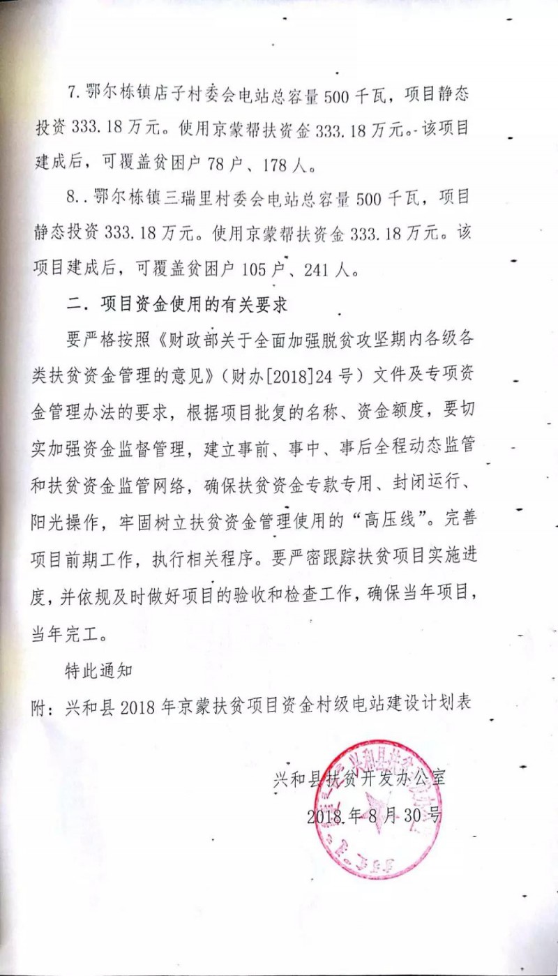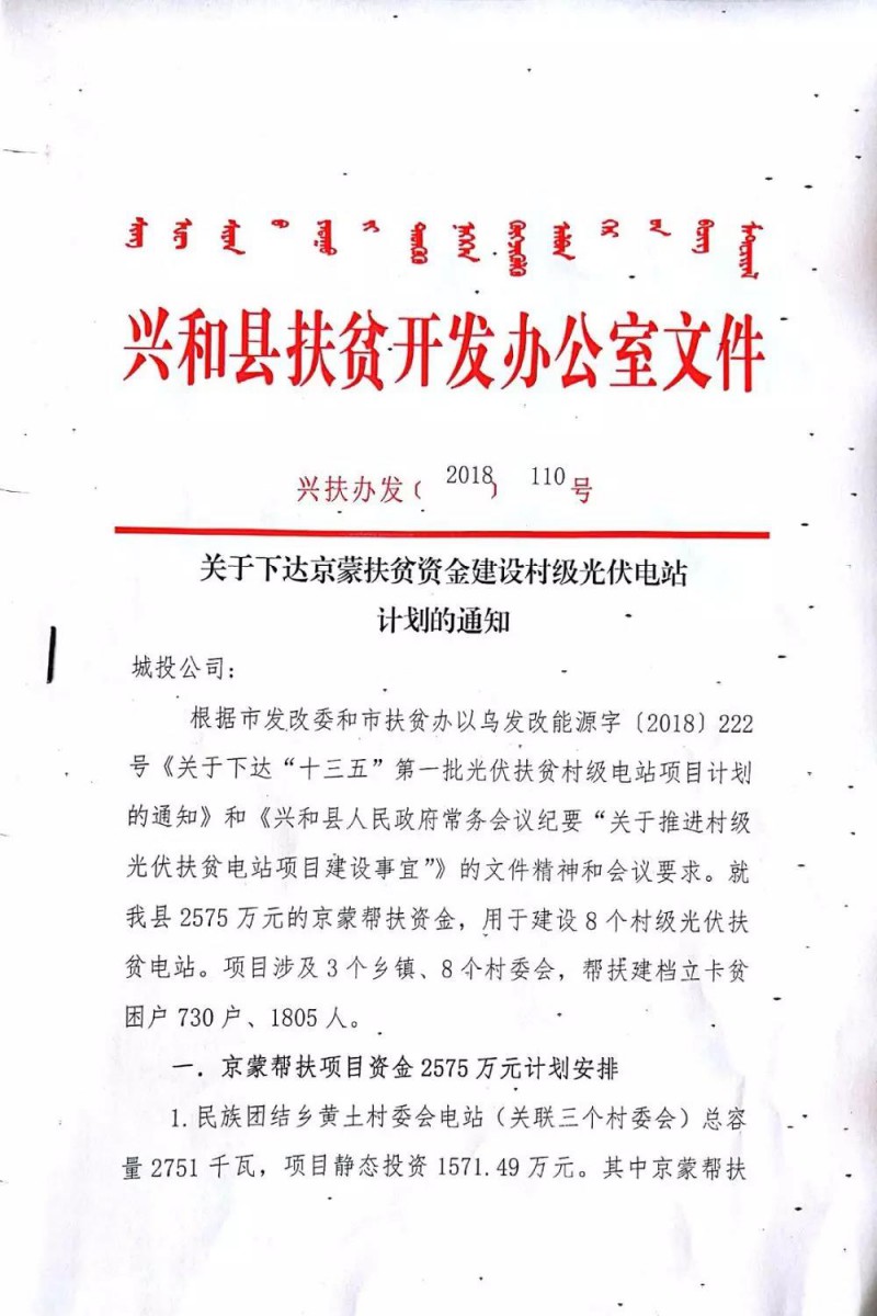 核心提示:內蒙古興和縣關于下達京蒙資金建設村級光伏電站計劃的通知
