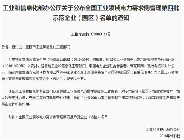 日前,工業和信息化部發布《關于公布全國工業領域電力需求側管理第四批示范企業(園區)名單的通知》,確定內蒙古盾安光伏科技有限公司等64家企業以及上海臨港裝備產業區等9家園區為全國工業領域電力需求側管理第四批示范企業(園區)。該通知還要求各地工業和信息化主管部門認真總結工業領域電力需求側管理工作經驗,推動工業領域電力需求側管理工作取得新成效。