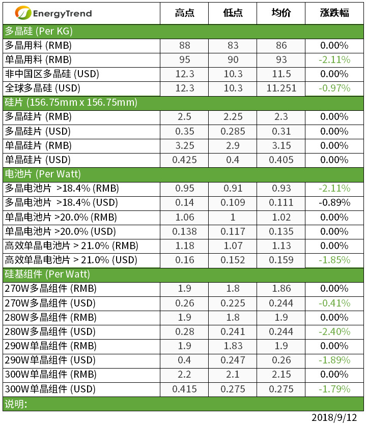 本周大陸國(guó)內(nèi)組件雖需求不振,但受成本制約,價(jià)格大致持穩(wěn)。高效單晶組件已開(kāi)始有詢(xún)單,估計(jì)與第四季領(lǐng)跑者項(xiàng)目的建設(shè)有關(guān)。目前中國(guó)國(guó)內(nèi)常規(guī)多晶價(jià)格維持RMB1.80-1.90/W,高效多晶也是在RMB1.80-1.90/W的價(jià)格。常規(guī)單晶則是RMB1.83-1.90/W的價(jià)位,高效單晶在RMB2.10-2.20/W,均價(jià)在2.15RMB/W。