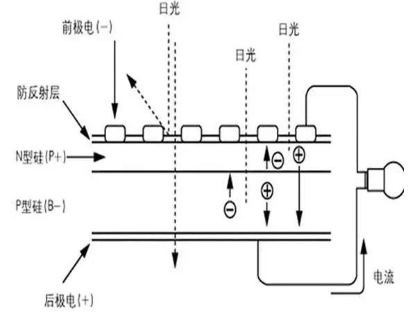 多晶硅太陽能電池芯片是具有光電效應(yīng)的半導(dǎo)體器件,半導(dǎo)體的PN結(jié)被光照后產(chǎn)生電流,當(dāng)光直射太陽能電池芯片,其中一部分被反射,一部分被吸收。一部分透過電池芯片、被吸收的光激發(fā)被束縛的高能級狀態(tài)下的電子,使之成為自由電子,這些自由電子在晶體內(nèi)向各方向移動,余下空穴(電子以前的位置)。空穴也圍繞晶體飄移,自由電子(-)在N結(jié)聚集,空穴(+)在P結(jié)聚集,當(dāng)外部環(huán)路被閉合,電流產(chǎn)生。