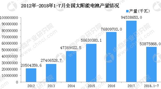 2012年-2017年全國太陽能電池產量穩步增長,2017年全國太陽能電池產量為94538653千瓦,同比增長30.62%。2018年1-7月全國太陽能電池產量為53875868千瓦,同比增長7.53%。