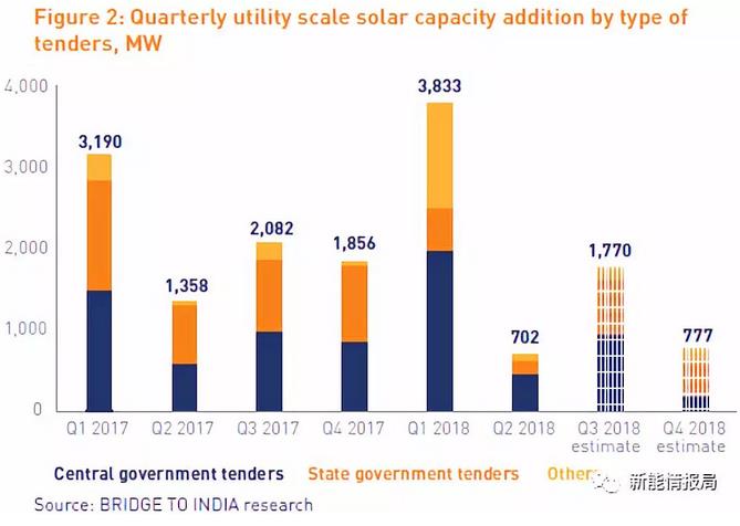 光伏電池和組件的保障關(guān)稅可能會(huì)導(dǎo)致大量開(kāi)發(fā)商在下一年放緩項(xiàng)目的建造速度。Bridge to india預(yù)計(jì)2018年第三季度的裝機(jī)規(guī)模約為1.77GW,第四季度為777MW。