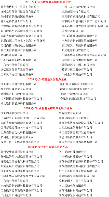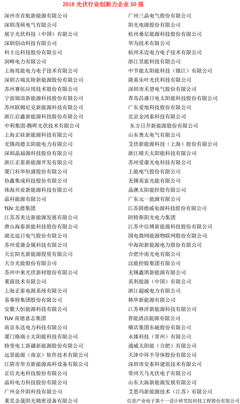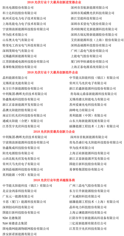 「PV TOP 50」2018光伏行業(yè)創(chuàng)新力企業(yè)50強(qiáng)暨各大單項(xiàng)獎(jiǎng)入圍企業(yè)名單: