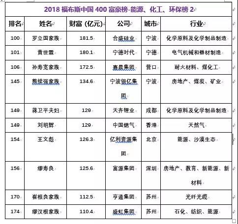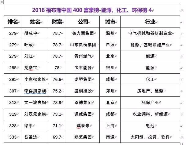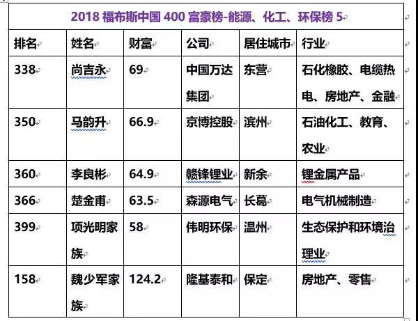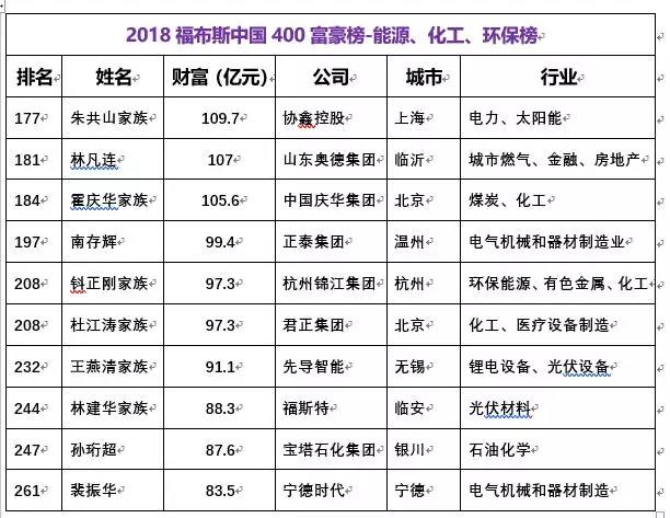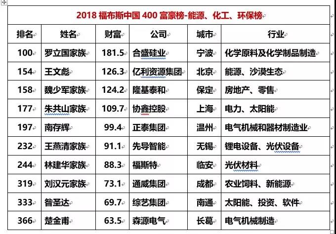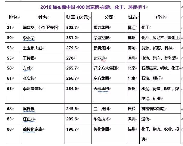 除了馬云、馬化騰、許家印、王健林等“常客”之外,還有諸多涉足能源、化工、環保領域的知名企業家入選,比如光伏領域的朱共山、劉漢元、南存輝等人及其家族,以及新奧集團王玉鎖家族等。