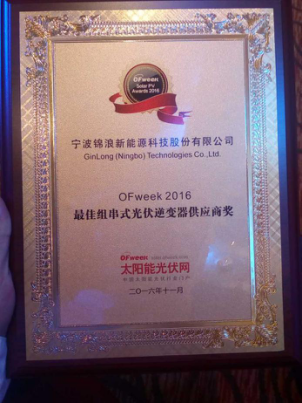 11月17日,“OFweek2016 中國太陽能光伏行業年度頒獎典禮”在深圳馬可孛羅好日子酒店隆重舉行,寧波錦浪新能源科技股份有限公司在光伏逆變器領域中屢創佳績,榮膺“2016最佳組串式光伏逆變器供應商獎”。