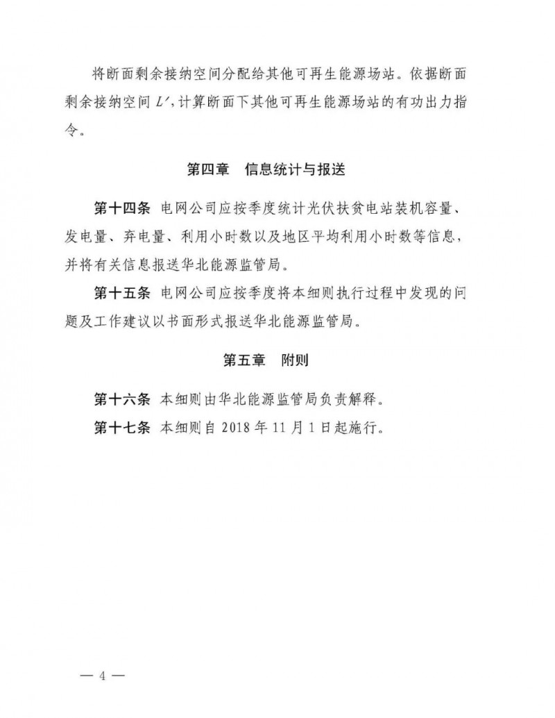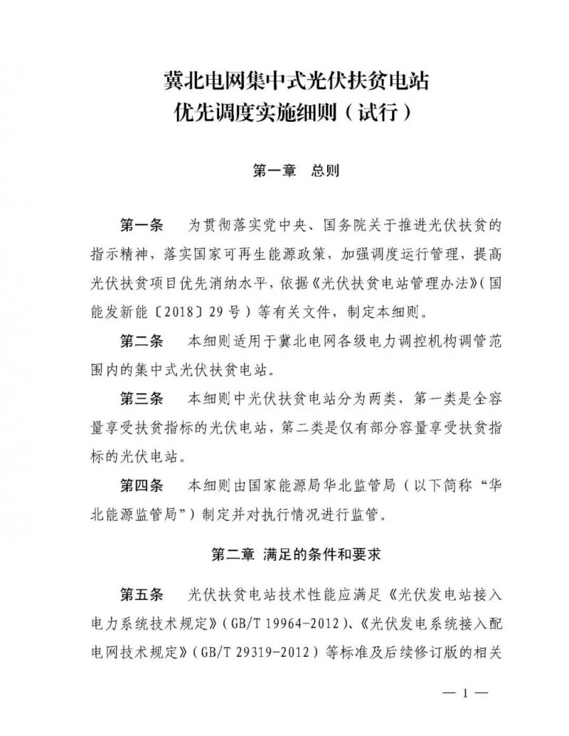 文件要求:華北電網(wǎng)有限公司,國網(wǎng)冀北電力有限公司,為貫徹黨中央、國務(wù)院關(guān)于打好扶貧攻堅(jiān)戰(zhàn)的重要指示,積極落實(shí)光伏扶貧有關(guān)政策,進(jìn)一步提高可再生能源消納水平,確保光伏扶貧項(xiàng)目電量?jī)?yōu)先消納,國家能源局華北能源監(jiān)管局組織制定了《冀北電網(wǎng)集中式光伏扶貧電站優(yōu)先調(diào)度實(shí)施細(xì)則(試行)》。經(jīng)向有關(guān)電力企業(yè)征求意見,現(xiàn)予印發(fā),請(qǐng)相關(guān)單位于2018年11月1日起執(zhí)行。 執(zhí)行中如遇重大問題,請(qǐng)及時(shí)報(bào)告我局。