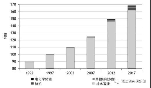 根據美國能源部全球儲能數據庫的數據,1997——2017年,全世界儲能系統裝機增長了70%,到170吉瓦左右(見圖2)。如今儲能市場在各國政府的政策鼓勵下得到了積極的發展,最近幾年間新建儲能項目及其裝機總規模有望增加數倍。