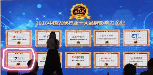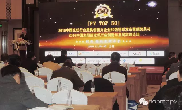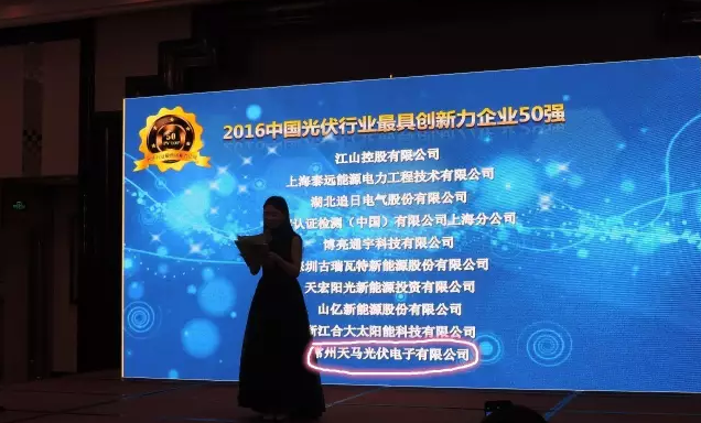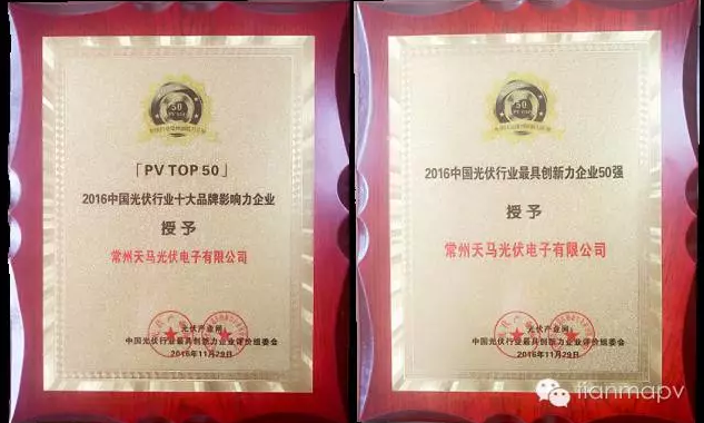 2016年11月29日,“PV TOP 50中國光伏行業最具創新力企業榜單發布暨頒獎典禮”在上海淳大萬麗酒店舉辦,同期舉辦“中國光伏產業創新與發展高峰論壇”,在50余行業媒體、行業協會專家、光伏投資開發商及主流企業等的見證下,常州天馬光伏榮獲“2016中國光伏行業十大品牌影響力企業”及“2016中國光伏最具創新力企業50強”兩大獎項。
