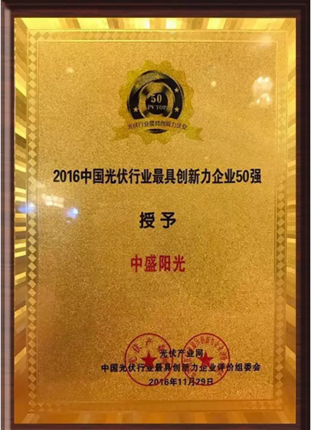 中盛從眾多候選企業(yè)中脫穎而出,榮膺“2016中國(guó)光伏行業(yè)十大品牌影響力企業(yè)”及“2016中國(guó)光伏行業(yè)最具創(chuàng)新力企業(yè)50強(qiáng)”。
