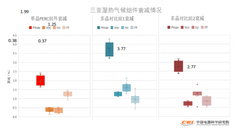 在三亞試驗(yàn)場中,組件平均工作溫度在40-50℃,最高運(yùn)行溫度可達(dá)70℃左右,組件經(jīng)歷14.5個(gè)月的高溫、高濕和戶外暴曬,單晶PERC組件相對于初始功率平均衰減1.99%,(相對標(biāo)稱功率平均衰減0.93%),開路電壓和短路電流衰減較小,主要為填充因子FF的衰減。而兩種多晶組件相對初始功率的衰減達(dá)到3.77%和2.77%(相對標(biāo)稱功率衰減3.26%和0.53%),主要衰減為短路電流的衰減。