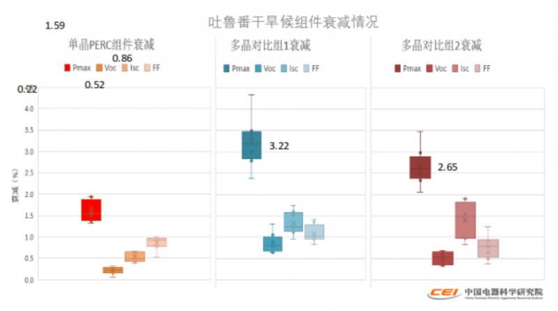 在吐魯番試驗(yàn)場,組件的在6~8月的日間平均溫度(10~14時(shí))可達(dá)50°C以上,8月的最高工作溫度達(dá)70°C以上,經(jīng)歷14個(gè)月的高溫、高輻照、沙塵和較高的晝夜、季節(jié)溫差,單晶PERC組件相對于初始功率平均衰減1.59%,(相對標(biāo)稱功率平均衰減0.58%),相比三亞實(shí)證項(xiàng)目,F(xiàn)F的衰減由1.25%降低為0.86%,同樣,單晶PERC組件衰減離散度小。兩種多晶組件相對初始功率的衰減為3.22%和2.65%,主要衰減仍為短路電流的衰減。