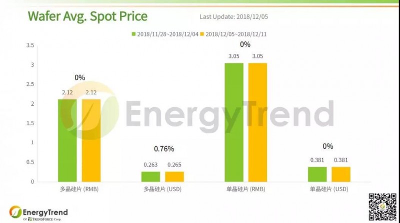 12月5日的報價顯示,常規多晶電池片人民幣價格從 RMB0.85/W 上漲至 RMB0.856/W,漲幅是 1.18%;美金價格從 US$0.095/W 來到 US$0.103/W,增長了 8.42%。常規單晶電池片的人民幣均價和美金均價為 RMB1.04/W 和 US$0.125/W,維穩不變。高效單晶電池片人民幣報價也保持不變,為 RMB1.16/W;其先前的美金報價為 US$0.157/W,最新一周增長了 5.1% 來到 US$0.165/W。特高效單晶電池片的人民幣維穩在 RMB1.25/W;美金均價為 US$0.175/W,較之前的 US$0.165/W上漲了 6.06%。