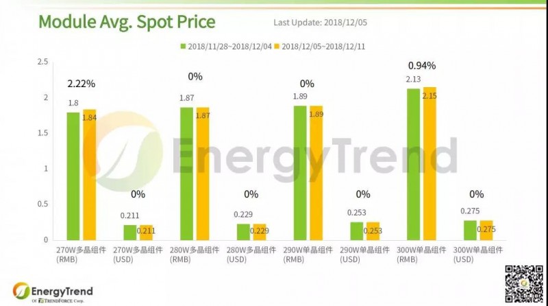 在最新一期報價中,光伏組件產品市場相對穩定。270W多晶組件的人民幣報價為 RMB1.84/W,上漲了 2.22%;海外均價仍舊為 US$0.211/W,持平不變。280W多晶組件兩個幣種報價保持不變,分別為 RMB1.87/W 和 US$0.229/W。290W單晶組件人民幣均為 RMB1.89/W,美金均價為 US$0.253/W,與上周一致。300W單晶組件的人民幣報價從 RMB2.13/W 上漲至 RMB2.15/W,漲幅為 0.94%;美金報價依舊為 US$0.275/W。